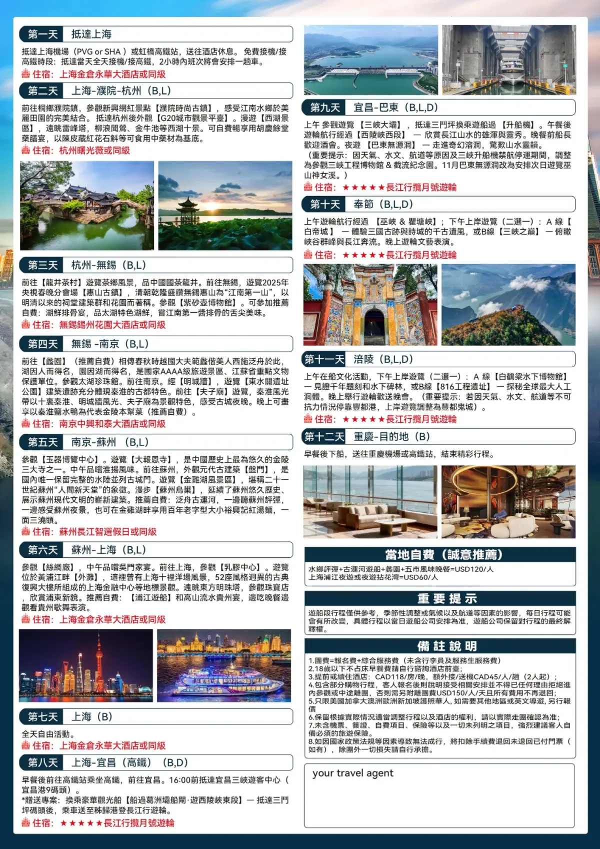 *既有水墨古韵的江南小镇,也有滚滚长江的三峡游轮; *品味江南特色美食:杭州龙井茶宴,江南风味宴,南京淮扬宴;上海本帮菜宴,无锡太湖风味宴,桐乡水乡风味宴。 *游轮途径瞿塘峡、西陵峡、巫峡,感受巴风楚韵,体验“江行万山间”的奇特景观