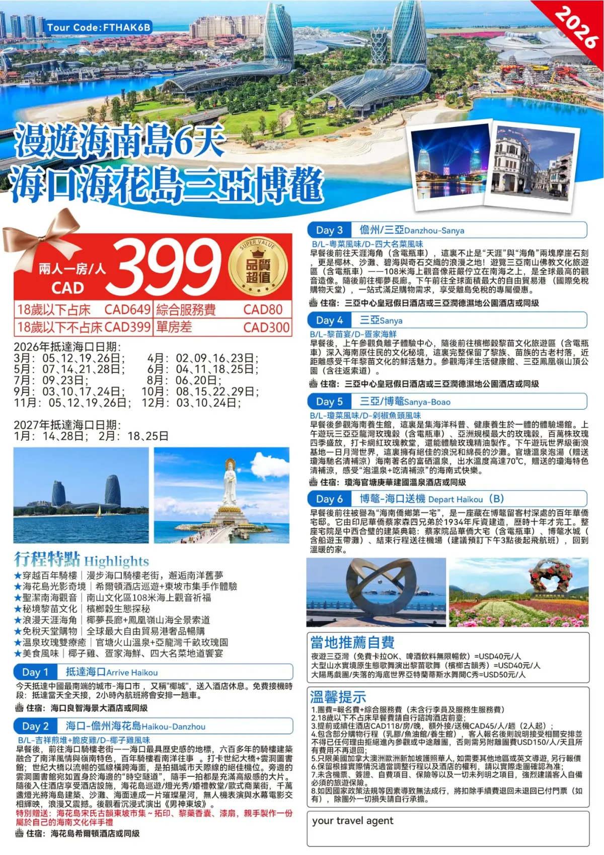 【深度遊覽】南山文化旅遊區-在108米南海觀音像下虔誠祈福、博鼇亞州論壇會址+被納入世界吉尼斯記錄的博鼇玉帶滩 【精彩体验】搭乘直升飞机、昂翔海上俯瞰三亚美景 【舒指往宿】全程精选携程四钻酒店、升级1万国际品牌5星酒店 【苦尖美食】海南文昌雞、海鲜遇上椰子雞、黎家風味