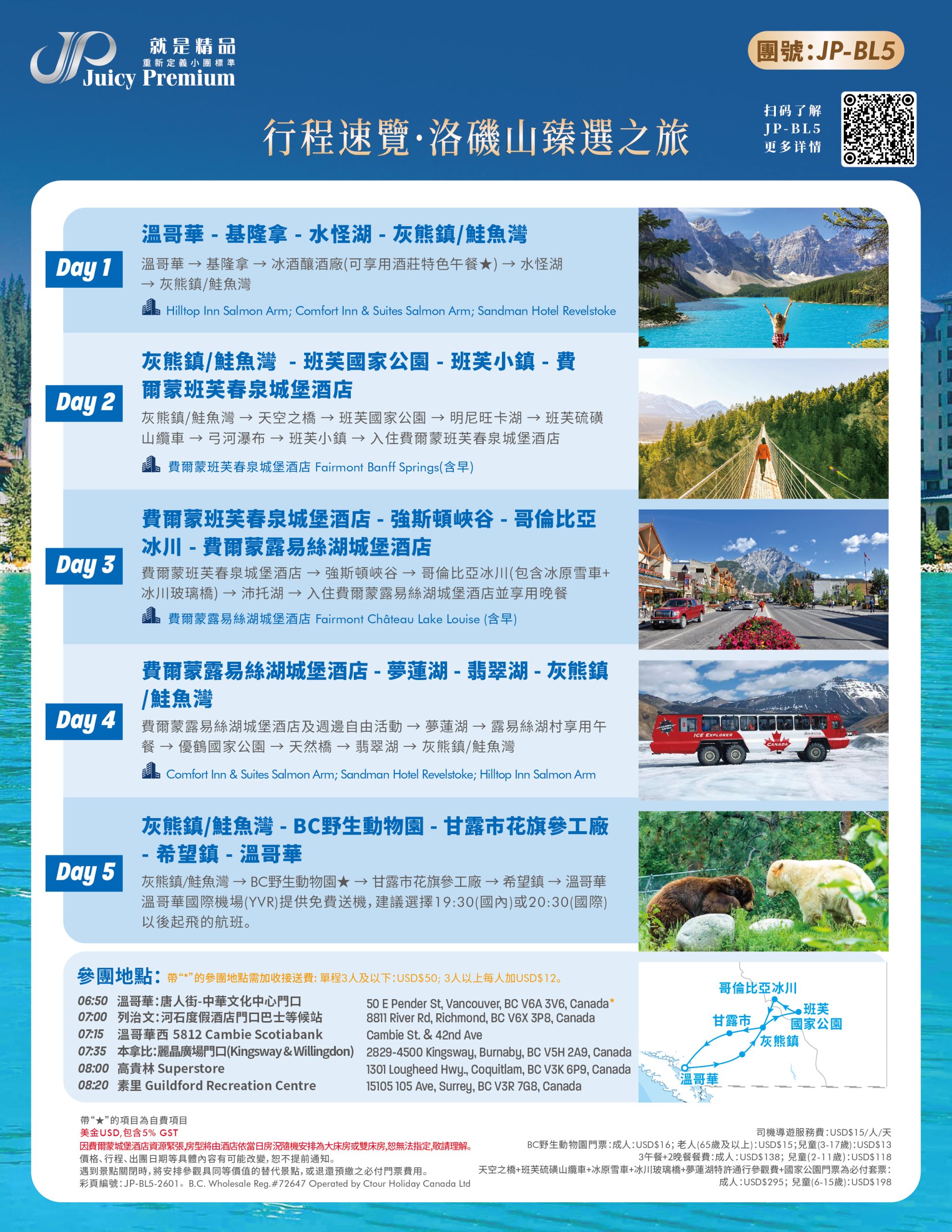 5日温哥华往返不超過13人的精品小團 | 全新奔馳高頂 | 班芙國家公園+哥倫比亞冰川+夢蓮湖+優鶴國家公園+BC野生動物園 5日遊(入住兩晚費爾蒙城堡酒店)