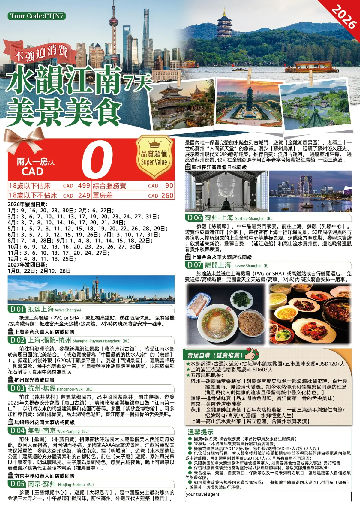 推荐自费(客人自愿参加):苏州运河游船+上海浦江夜游+全程五市风味晚餐=USD120/人;千古情大型演出(或精彩马戏杂技)60美金/人