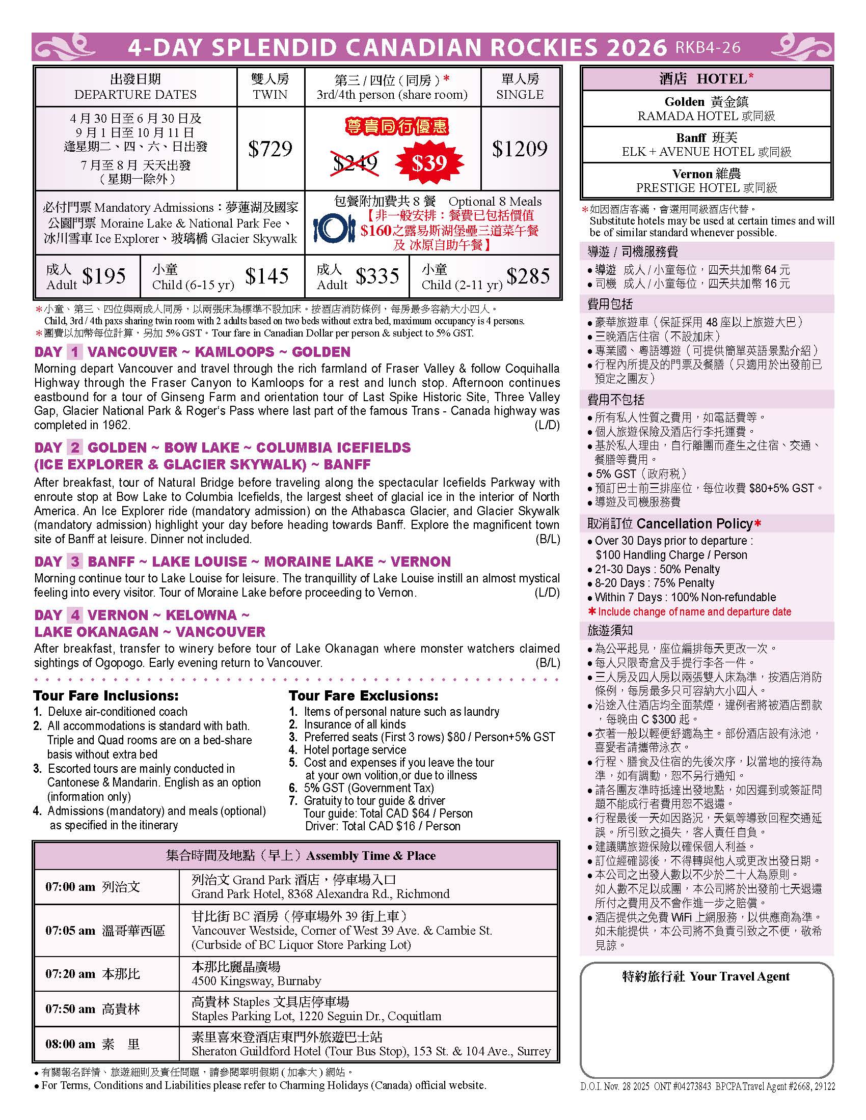 為公平起見,座位編排每天更改一次。•每人只限寄倉及手提行李各一件。•三人房及四人房以兩張雙人床為準,按酒店消防條例,每房最多只可容納大小四人。•沿途入住酒店均全面禁煙,違例者將被酒店罰款,每晚由C $300起。•衣著一般以輕便舒適為主。部份酒店設有泳池, 喜愛者請攜帶泳衣。•行程、膳食及住宿的先後次序,以當地的接待為準,如有調動,恕不另行通知。•請各團友準時抵達出發地點,如因遲到或簽証問題不能成行者費用恕不退還。•行程最後一天如因路況,天氣等導致回程交通延誤。所引致之損失,客人責任自負。•建議購旅遊保險以確保個人利益。•訂位經確認後,不得轉與他人或更改出發日期。•本公司之出發人數以不少於二十人為原則。如人數不足以成團,本公司將於出發前七天退還所付之費用及不會作進一步之賠償。•酒店提供之免費WiFi上網服務,以供應商為準。如未能提供,本公司將不負責引致之不便,敬希見諒。