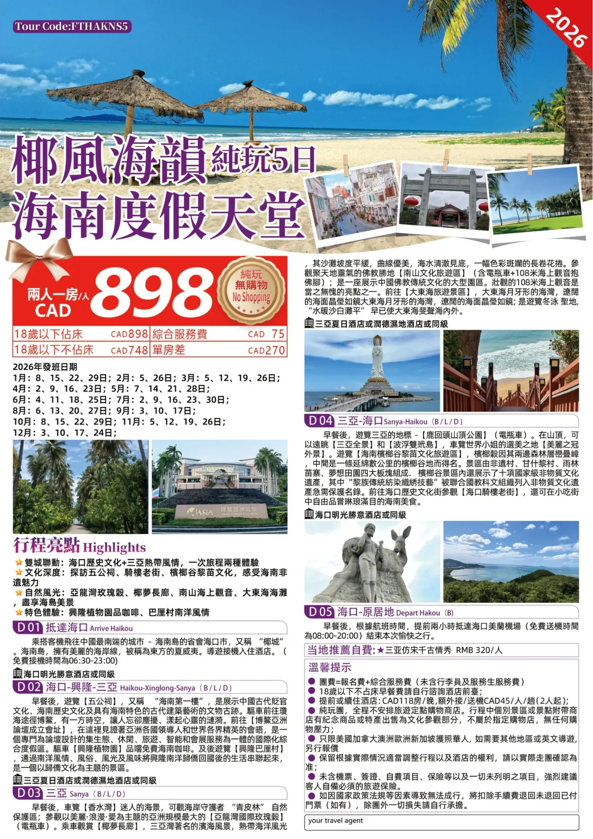 【特色美食】農家風味,海鮮風味,南山素宴 【住宿安排】全程入住市區優質酒店 【匠心行程】大東海旅遊區、佛教聖地 海上觀音、鹿回頭、海南檳榔穀
